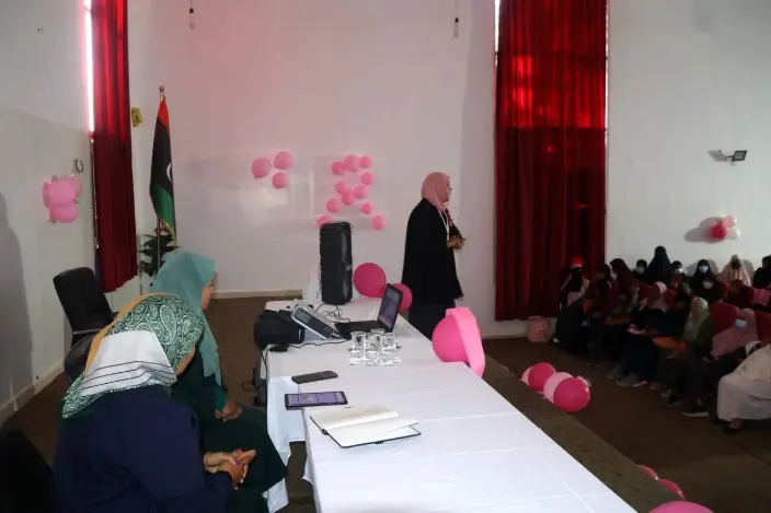 ألقت د. المتميزه فايزة بلقاسم الحرابي و د. سناء سعيد الغريب المحاضرة التوعيه و تخللها اسئلة الحاضرات حيث تجاوز عددهن اكتر من178بين طالبة و معلمة وسيدة.